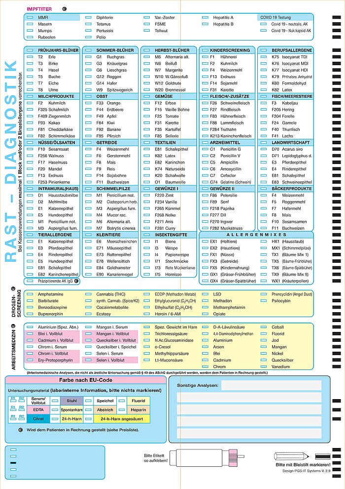 In diesen Anforderungsbelegen, die wir Ihnen selbstverständlich gerne kostenlos zur Verfügung stellen, sind alle Routineparameter aufgelistet. Zur Anforderung des entsprechenden Parameters müssen Sie diesen lediglich mit einem Strich markieren. Zur besseren Einlesbarkeit verwenden sie bitte Stifte auf Graphitbasis.